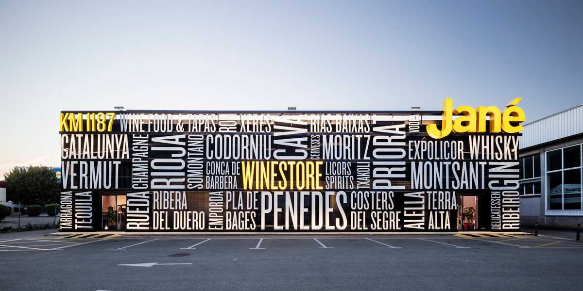 Чтобы сделать испанский супермаркет спиртных напитков Jane заметным для машин, проезжающих по трассе KM1187, дизайнеры украсили фасад названиями напитков и винных регионов страны. Внутренний интерьер стал продолжением лаконичной и эстетичной навигации.