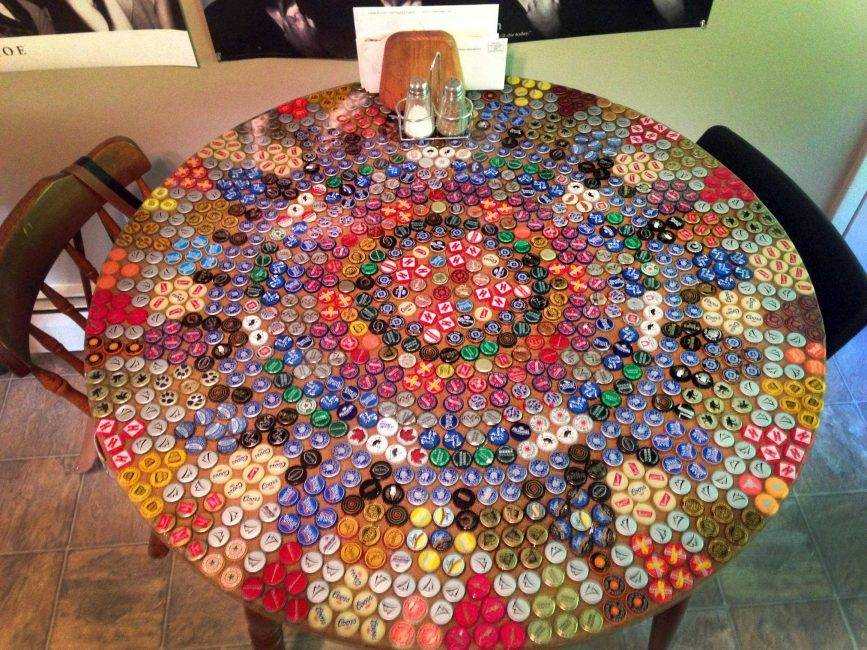Из пробок можно делать не только предметы интерьера, но и декорировать ими имеющиеся, как было, например, со столешницей.