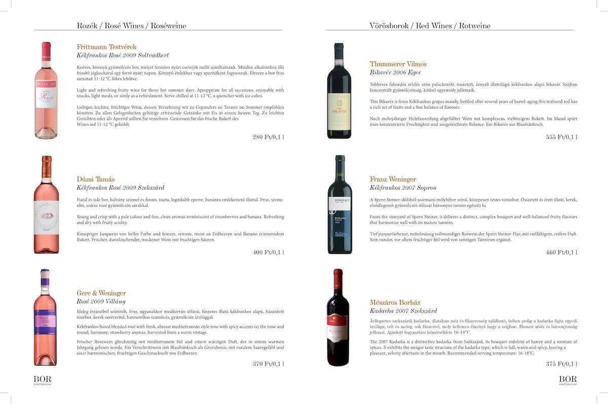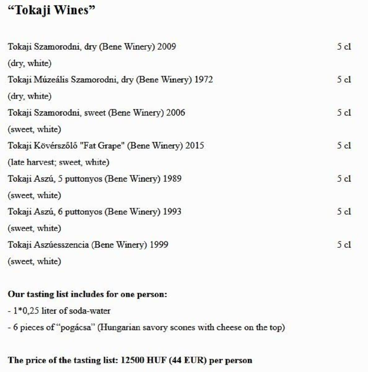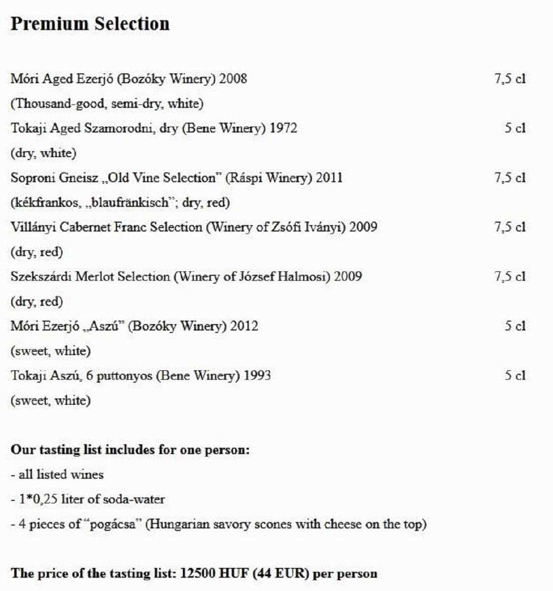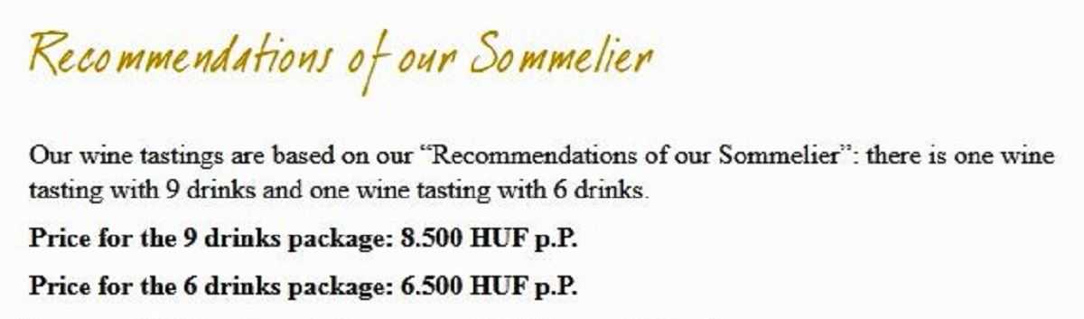 Дегустация здесь обычно проводится для посетителей, разбитых на группы. В зависимости от числа венгерских вин (три или пять), стоимость мероприятия для одного гостя составит 8–12 €. Обстановка, располагающая к дружескому общению, создается не только с помощью интерьера, но и благодаря приятным мелодиям, исполняемым профессиональными музыкантами.
