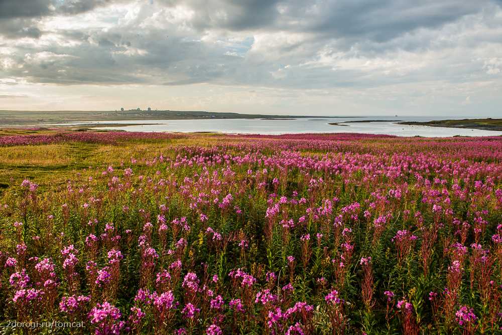 Растительность на Рыбачьем требует отдельного описания. Для меня, человека в первый раз в жизни оказавшегося в летней арктической тундре, это было погружением в невероятную красоту. Говорят, что в конце июня, когда она зацветает, тундра самая красивая, но меня заворожила тундра августовская. Мягкая, мшистая, с полями розового иван-чая, собравшая в себе все оттенки зеленого, от салатового и изумрудного до травяного и болотного, наполненная доселе неизвестными растениями и их ароматами, ягодами и грибами, она, сколько хватает глаз, выстилает склоны сопок и плато.